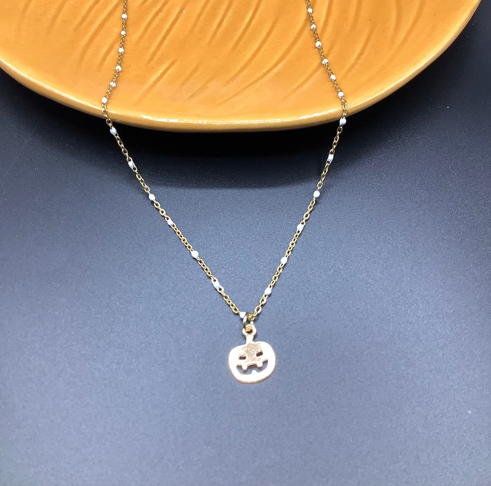 Collana in acciaio inossidabile intermezzata da pallini smaltati di colore bianco e charm in metallo…Lunghezza collana cm 45 + cm 5 di allungamento…Hand Made ❤️