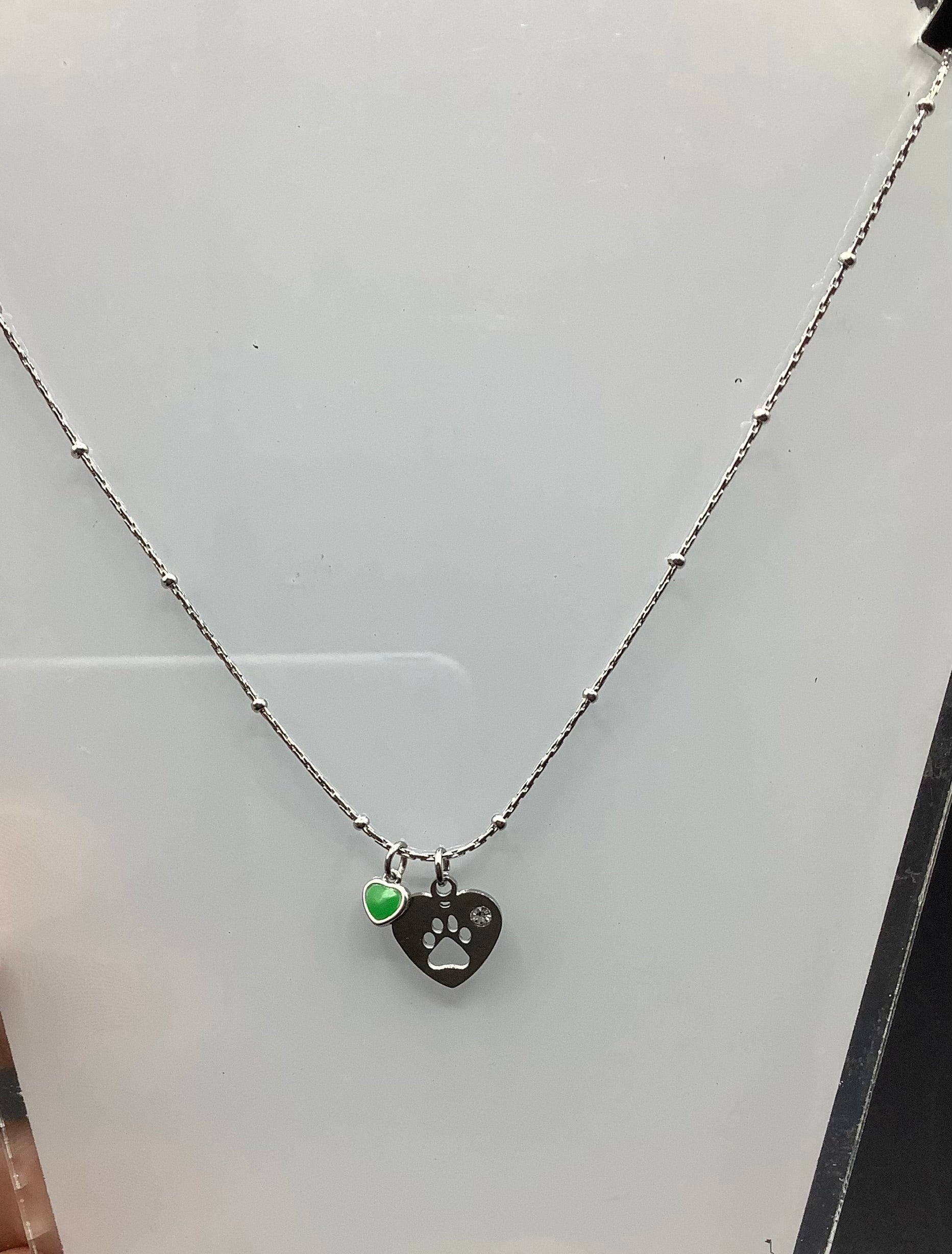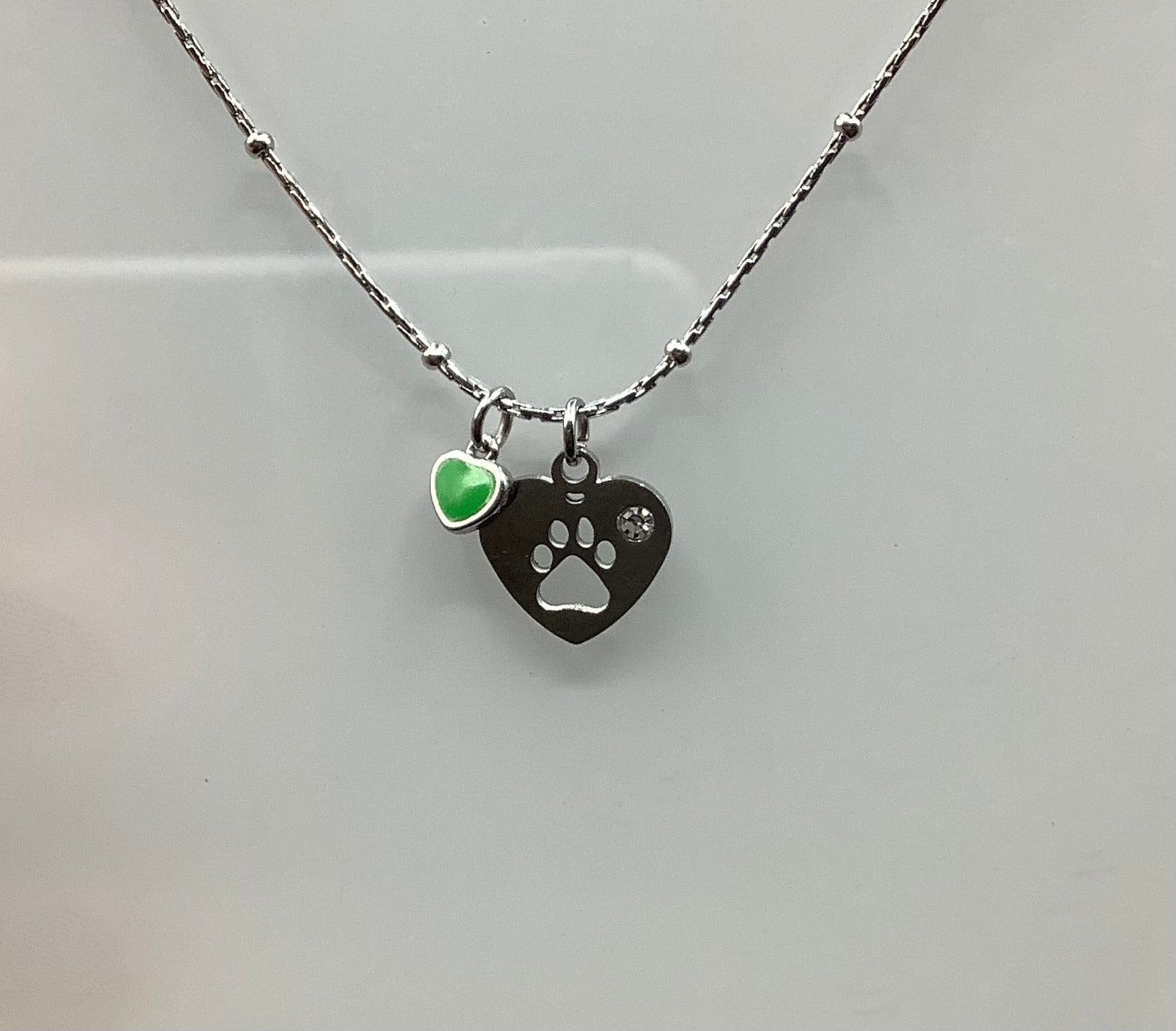 Collana con 2 charms…1 cuore con impressa impronta di zampa di cagnolino ed un piccolo strass bianco cm 1,5…1 cuoricino smaltato verde…Lunghezza collana cm 40 + cm 5 dí allungamento…Acciaio inossidabile…Hand Made ❤️