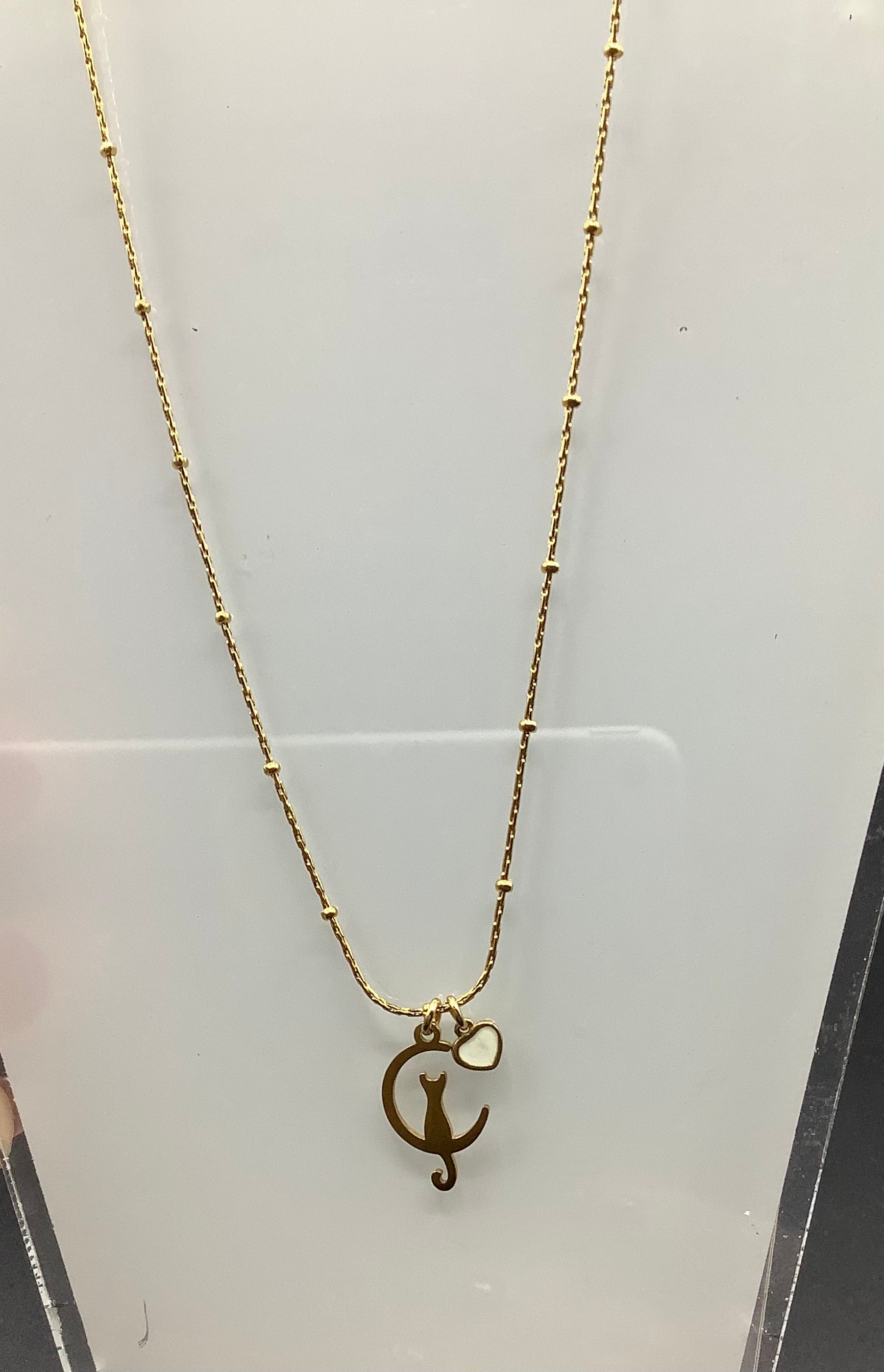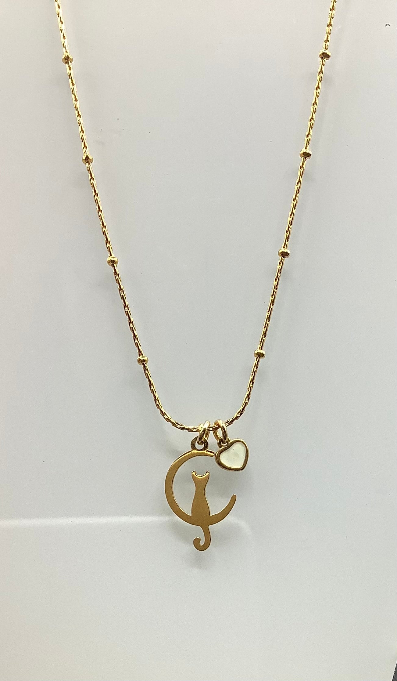 Collana con 2 charms…1 mezza luna con gattino cm 2…1 cuoricino smaltato bianco cm 0,50…Lunghezza collana cm 40+ cm 5 allungamento…Acciaio inossidabile…Hand Made ❤️
