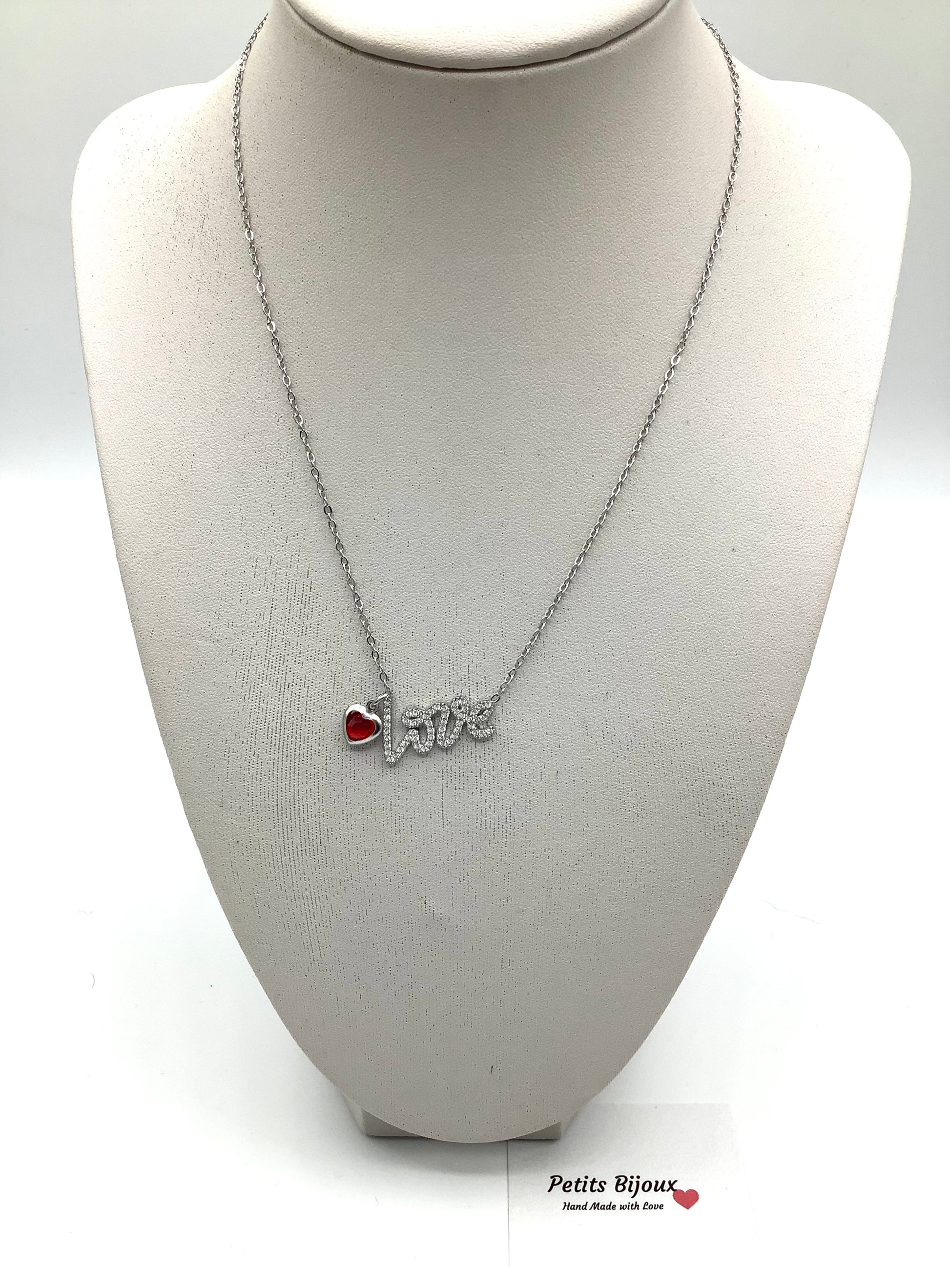 Collana con scritta LOVE in strass bianchi e a lato piccolo cuoricino con strass rosso…Acciaio inossidabile…Lunghezza cm 41 + cm 5 allungamento…Hand Made❤️