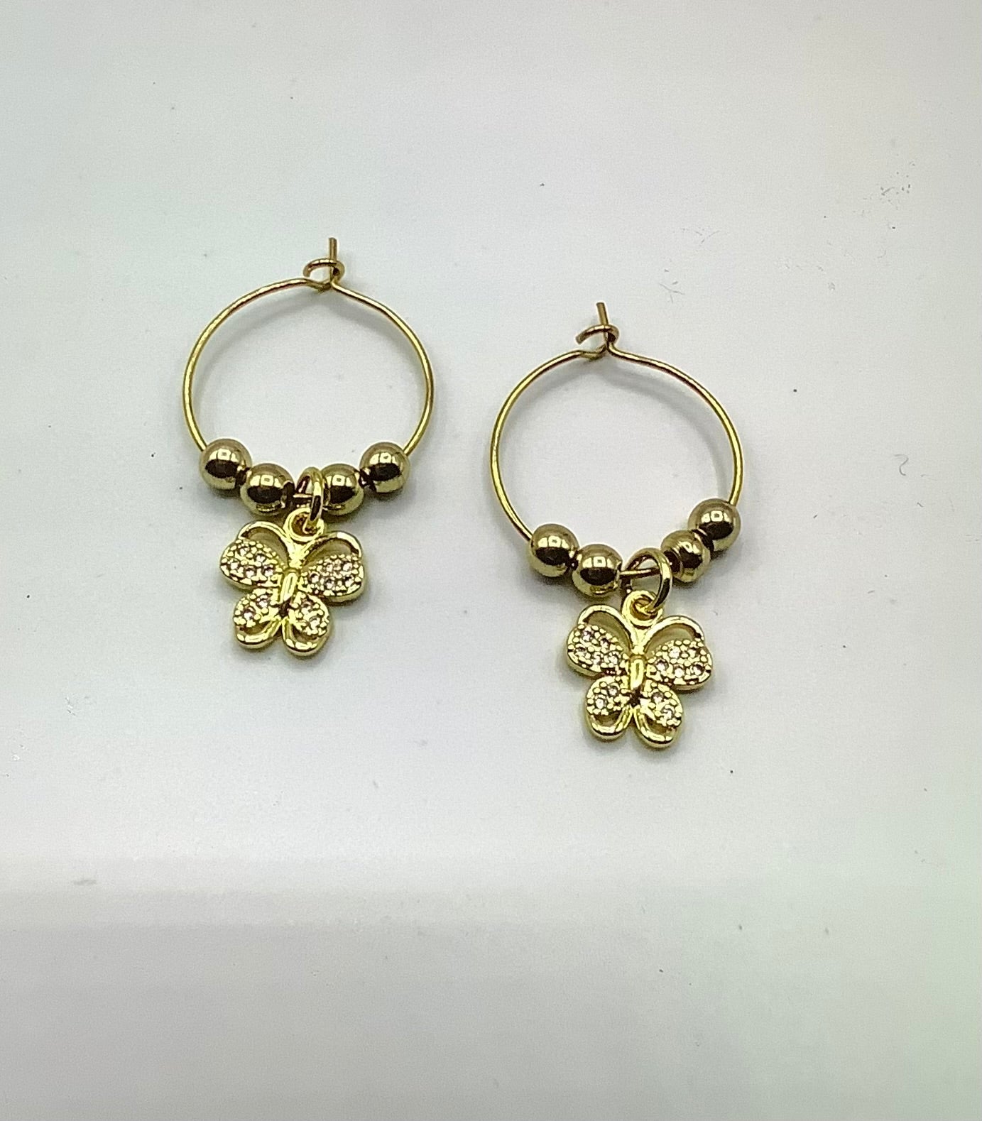 Orecchini a cerchio con charms a farfalla tempestati di strass bianchi…Per lobi forati…Diametro cm 2…Acciaio…Hand Made ❤️