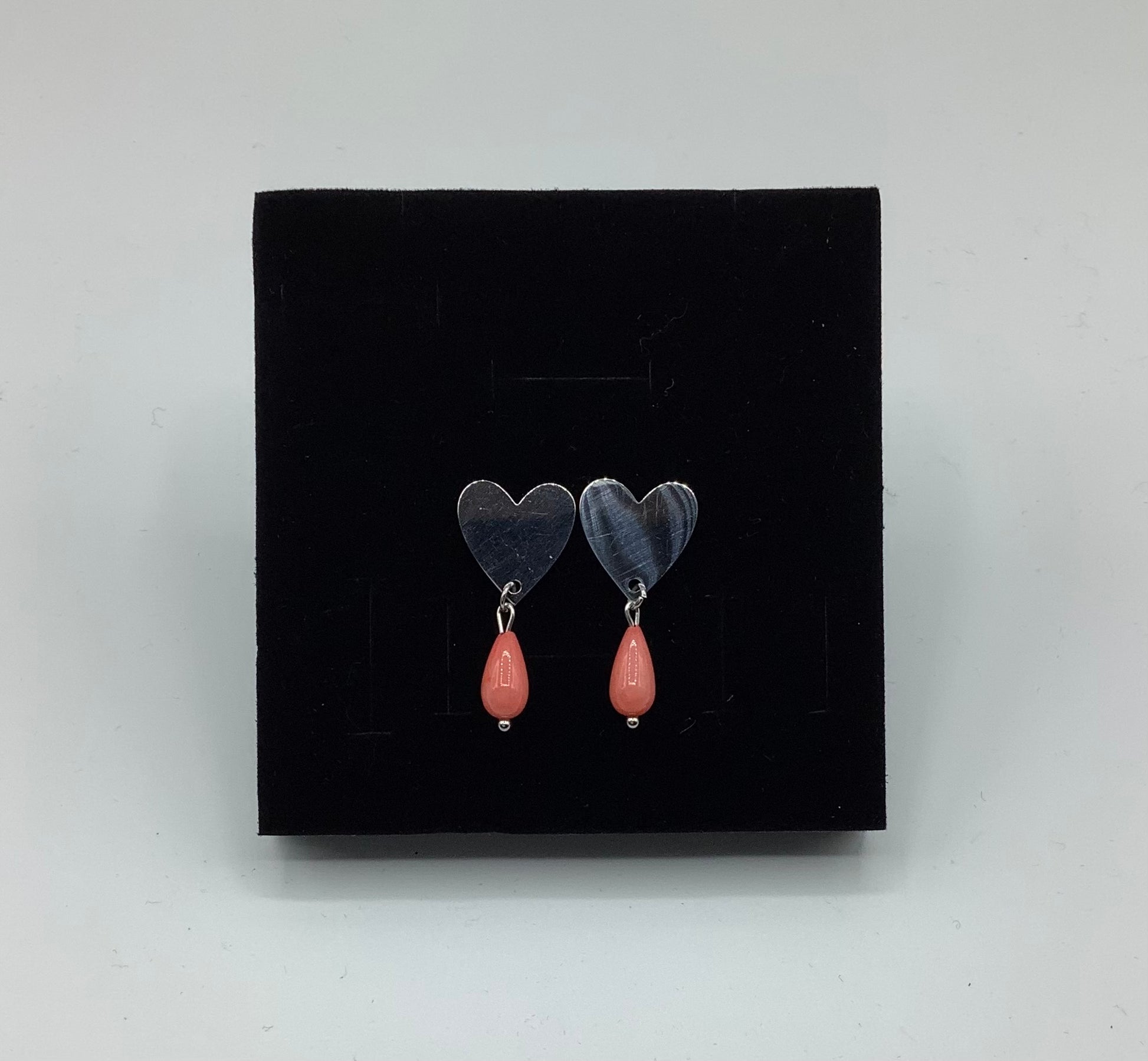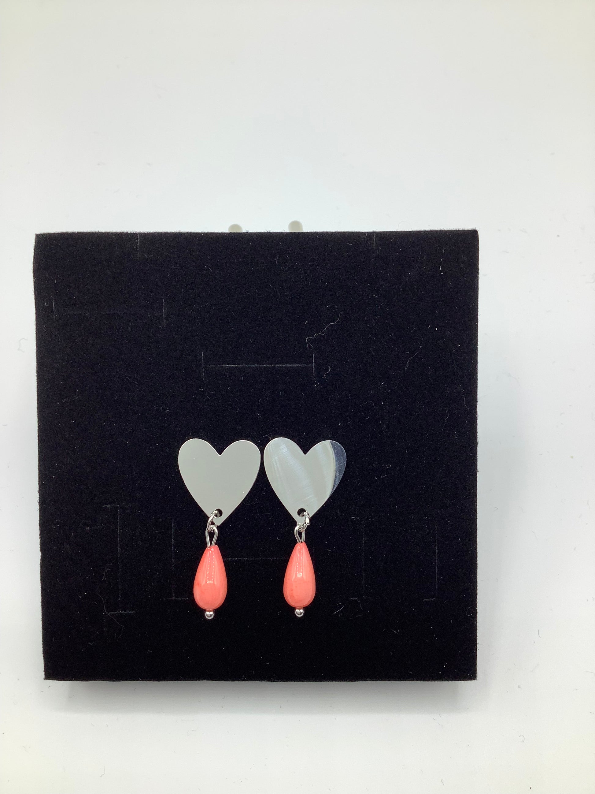 Orecchini a cuore in acciaio e pendente a goccia di pasta di corallo rosa…